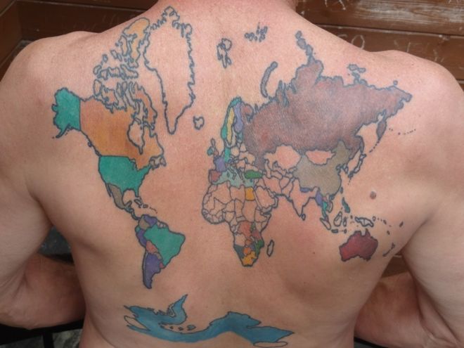 Ενας Αμερικανός ταξιδιώτης αποφάσισε να μετατρέψει την πλάτη του σε παγκόσμιο χάρτη κάνοντας ένα τεράστιο τατουάζ και βάζοντας χρώμα σε κάθε χώρα που επισκέπτεται.